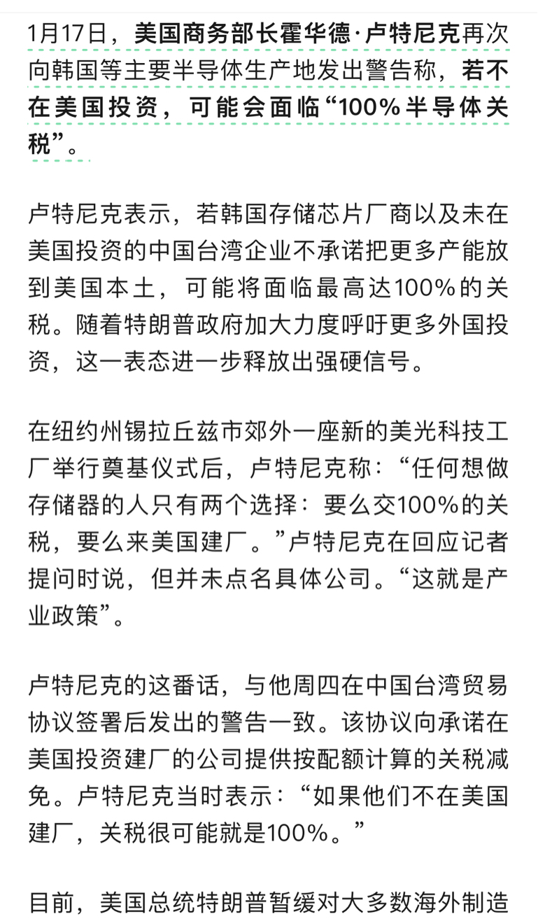 1月17日美对韩等主要半导体生产地警告可能面临100%半导体关税