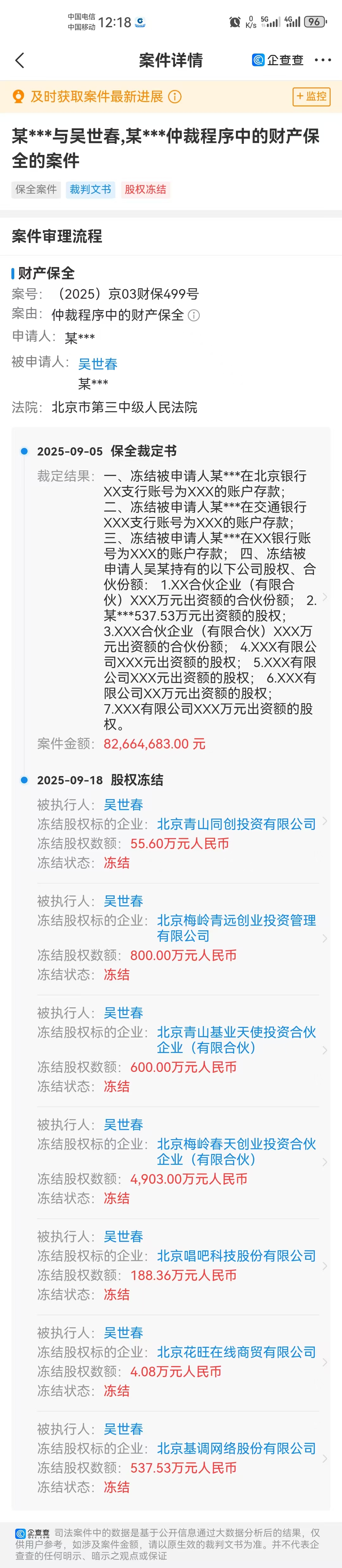 看了最近的消息都是在说吴世春被冻结股份,打开企查查一下还真被吓到都是诉讼风险