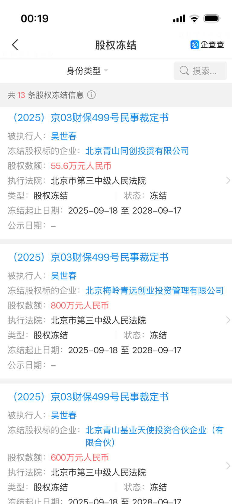 睡不着查资料,发现吴世春光股权冻结信息就有13条,散户把票投给他的话放心吗?我看