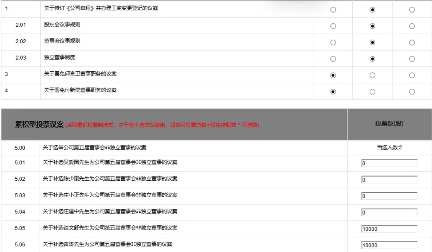 投票咯,累积投票不能有空格,不选的地方填0,选的填自己持股数