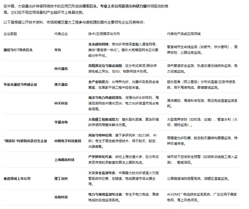 中国哪些企业在大容量光纤传感网络技术应用方面比较强?