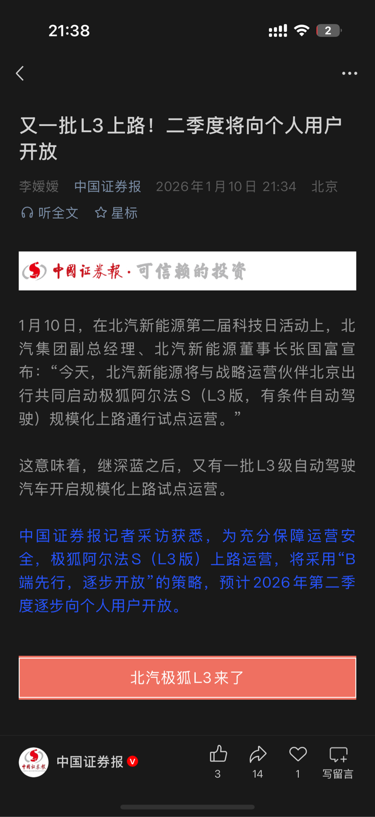 又一批L3上路!二季度将向个人用户开放李嫒嫒中国证券报2026年1月10日21: