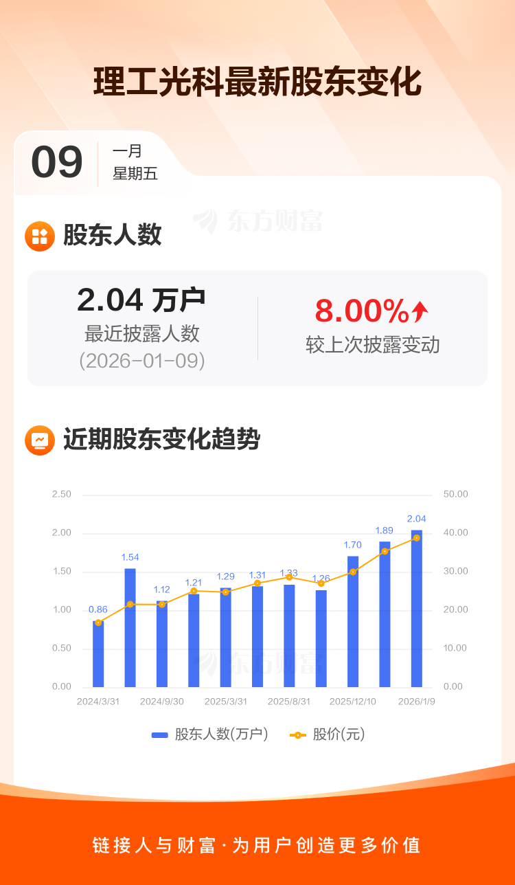 理工光科:截至1月9日最新股东户数2.04万户,较上期增加8.00%