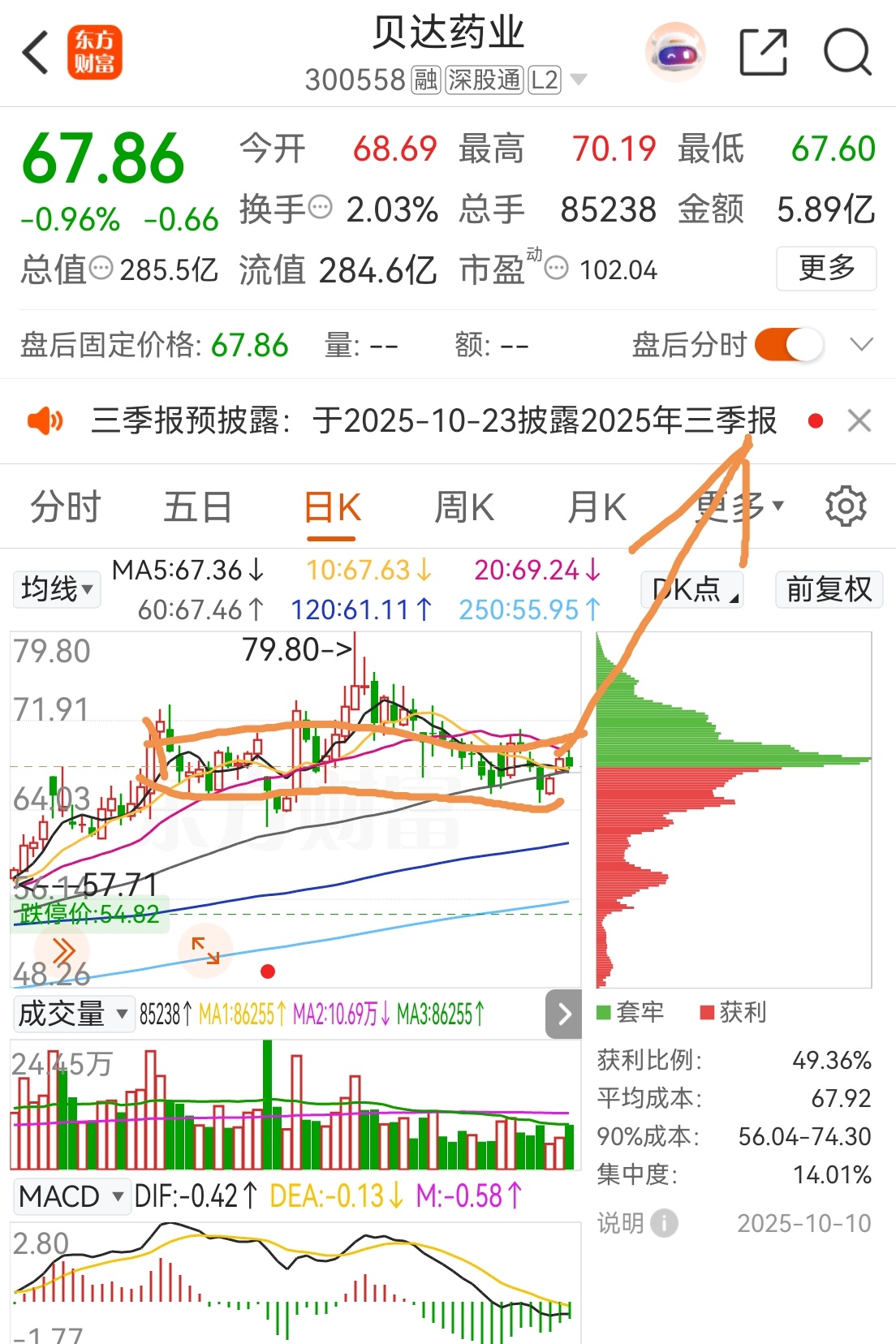 $贝达药业(SZ300558)$ 周末不开盘,贝达药业近期的筹码峰已经高度聚集在70元左右,就等龙门一跃而起!没有只涨不跌股票,也没有只跌不涨的股票 贝达药业已经提前一个月洗盘打压下来,该走的不坚定的赚钱的早走了,现在拐点已经就是禾元生物上市时间点。#周末杂谈# #强势机会# #周度策略#