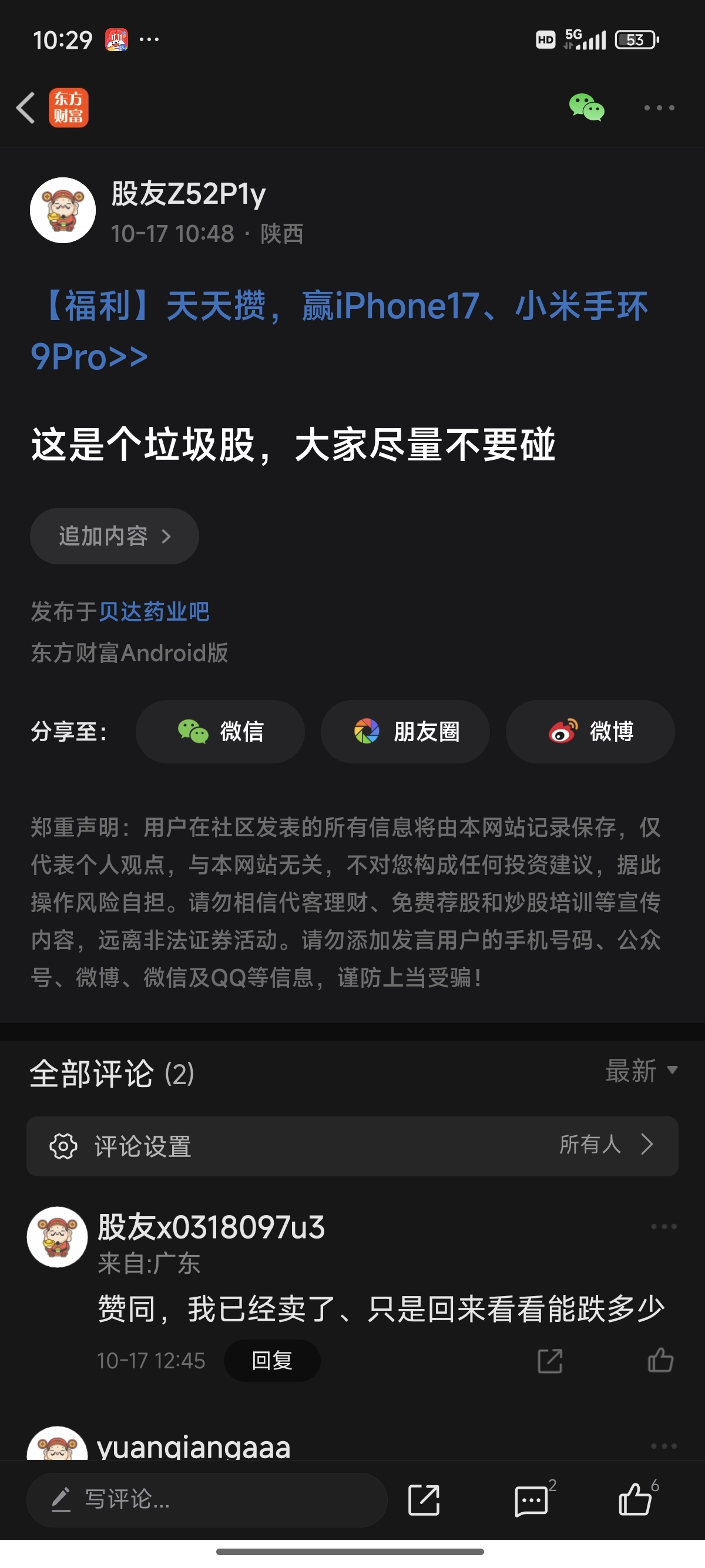 温馨提示: 1.根据《证券法》规定,禁止编造、传播虚假信息或者误导性信息,扰乱证券市场;2.用户在本社区发表的所有资料、言论等仅代表个人观点,与本网站立场无关,不对您构成任何投资建议。用户应基于自己的独立判断,自行决定证券投资并承担相应风险。《东方财富社区管理规定》