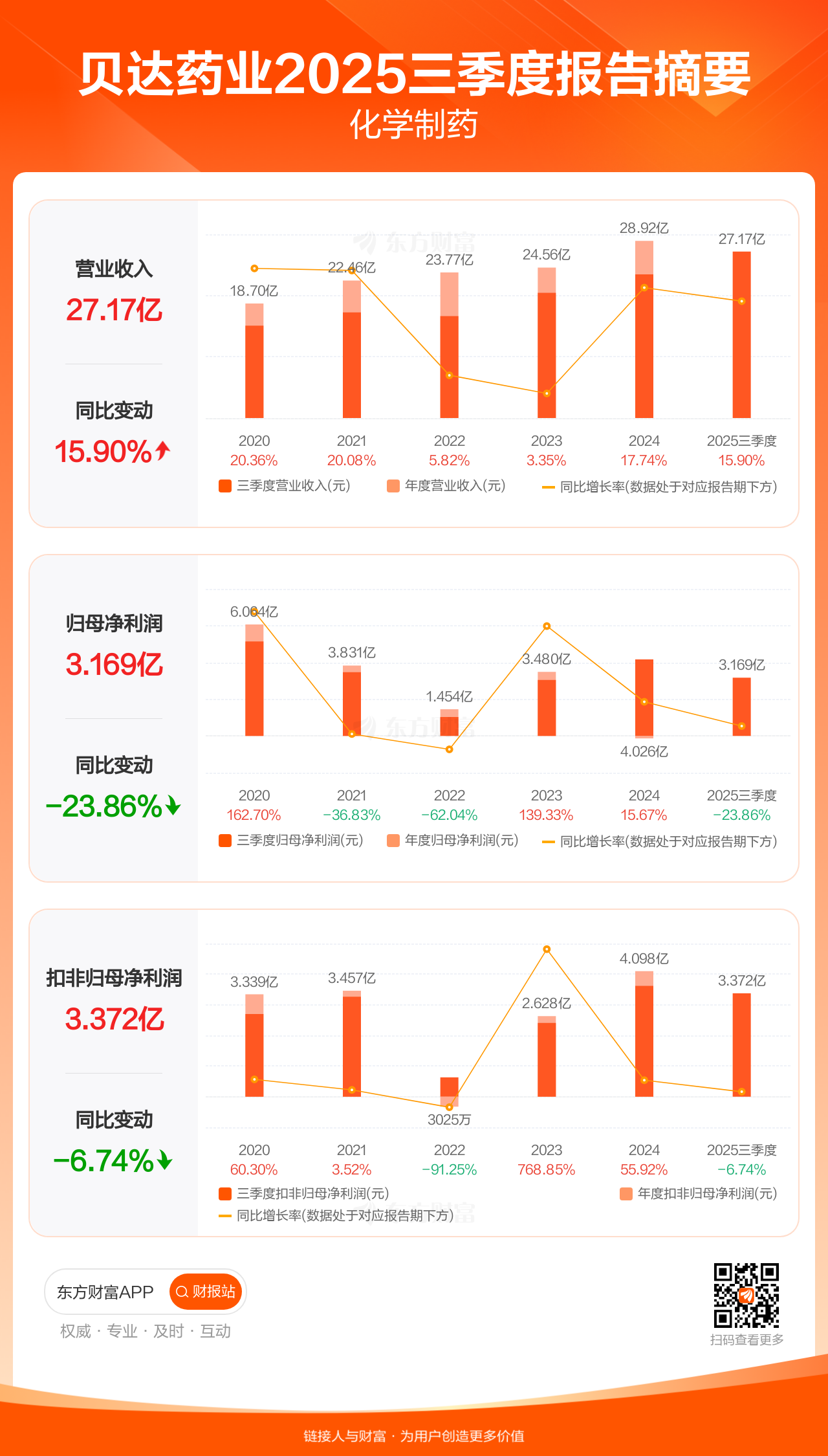 贝达药业10月28日发布2025年三季报显示,公司前三季实现营业收入27.17亿元,同比增长15.90%;归母净利润3.17亿元,同比下滑23.86%;扣非归母净利润3.37亿元,同比下滑6.74%。
