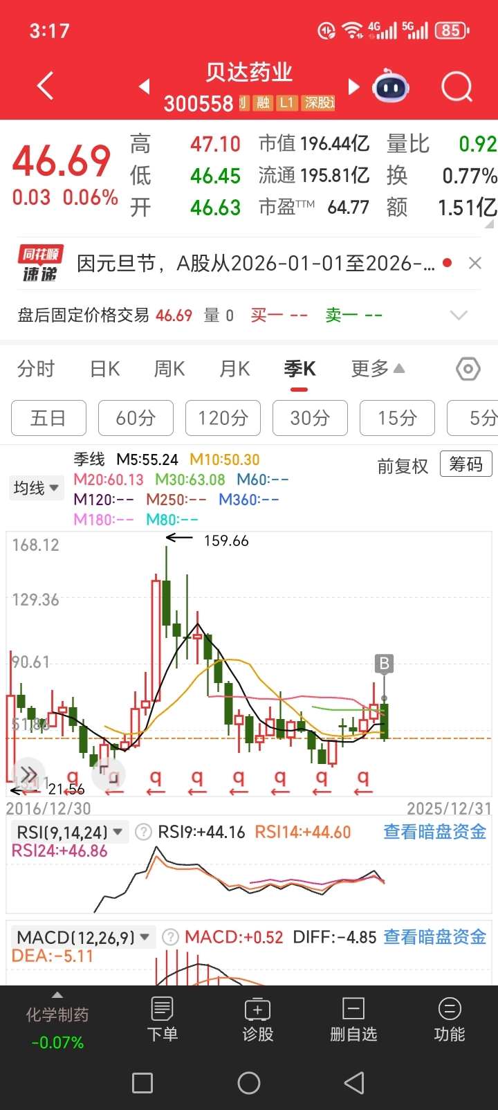 $贝达药业(SZ300558)$ 刚做了几天的贝达股东,和你们这些老股东探讨一下,看看贝达的季线有没有做头肩底的可能。