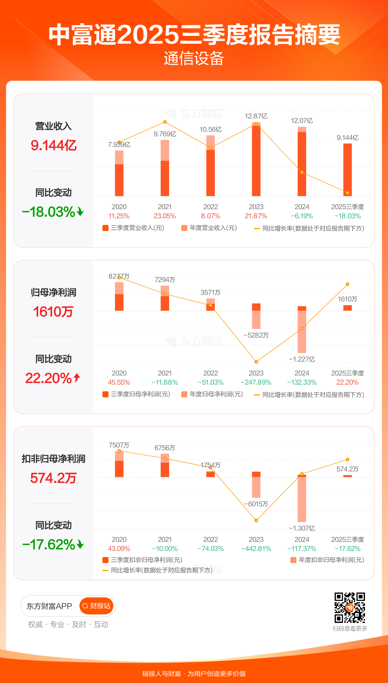 中富通10月30日发布2025年三季报显示,公司前三季实现营业收入9.14亿元,同比下滑18.03%;归母净利润1610.12万元,同比增长22.20%;扣非归母净利润574.16万元,同比下滑17.62%。