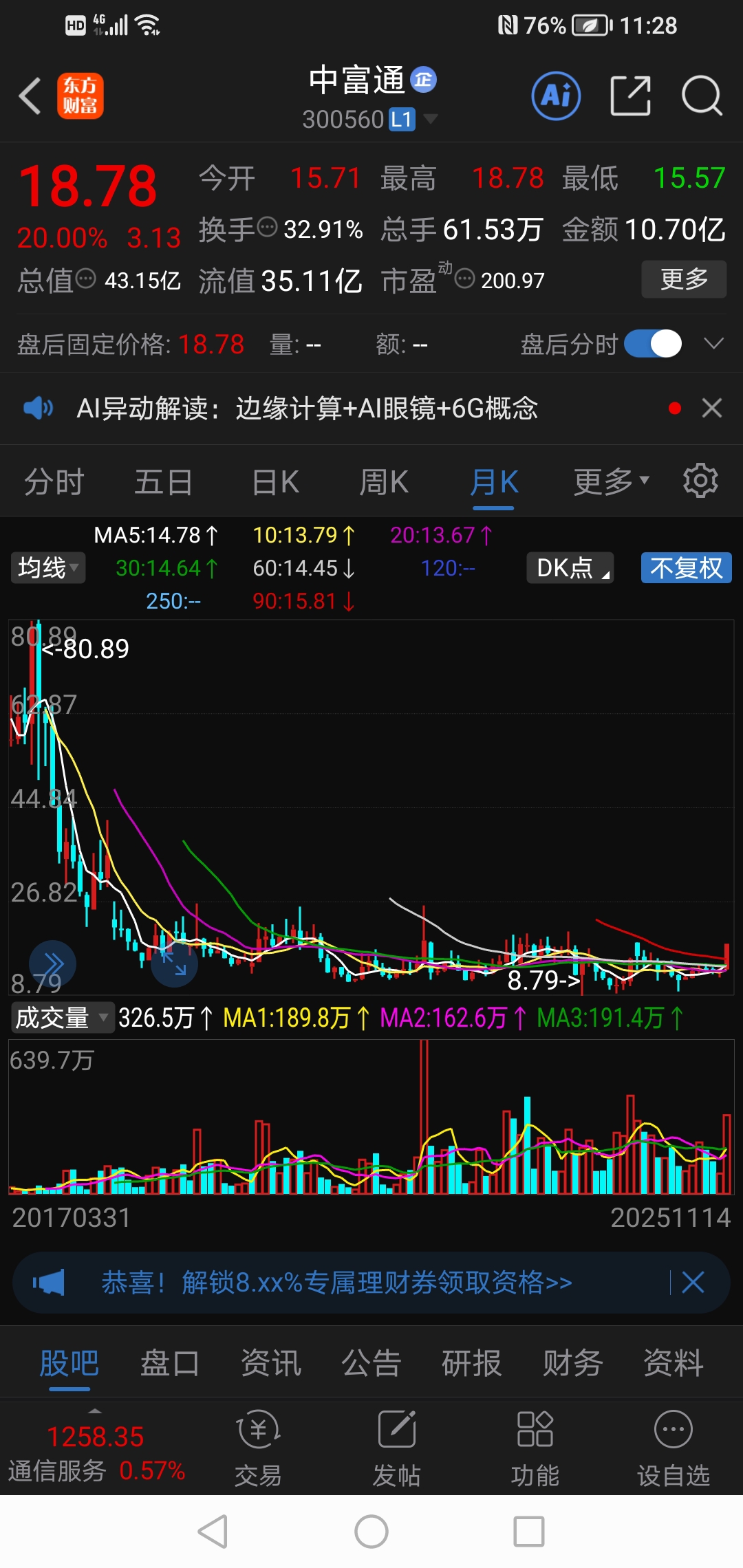 $中富通(SZ300560)$ 月线突破起飞