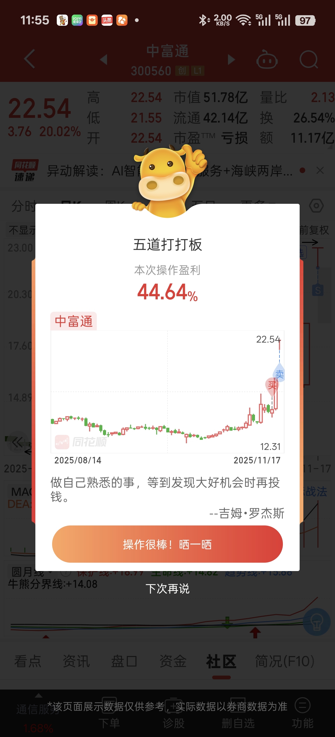 $中富通(SZ300560)$ $福石控股(SZ300071)$ 卖飞也行,人生何处无芳草,再寻下一站是幸福,福石我也走了,切换,手上还有其他的调整的,总是先挨打再吃肉,连滚带爬的
