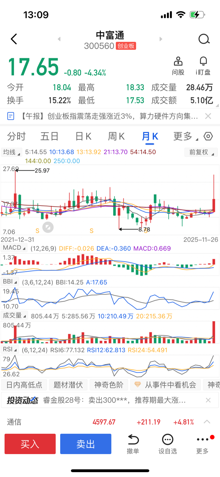 $中富通(SZ300560)$ 跟21年差不多的样子。什么时候换手低于百分之三才能建仓。我玩中富通四年多了,庄家是非常凶悍。个人观点,不喜请吾喷。