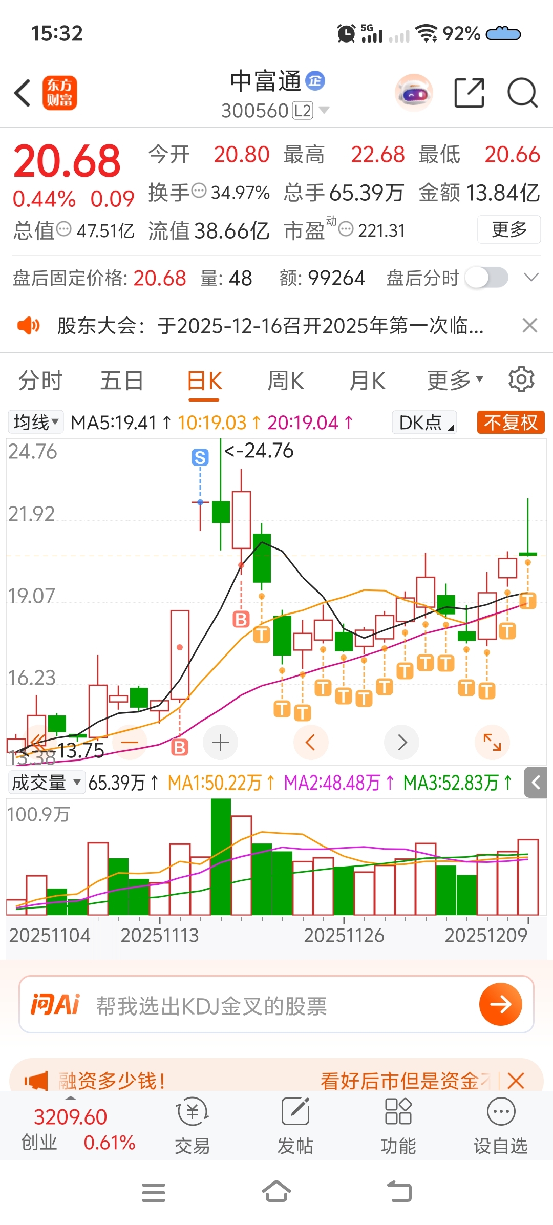 $中富通(SZ300560)$ 今早盘冲高一笔全部卖光,11/14到今天,全仓守中富 收益很满意。感谢主力抬轿子!尾盘集合竞价买回几手做种