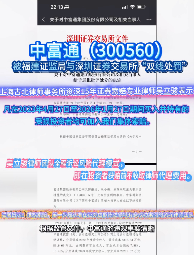 $中富通(SZ300560)$ 中富通(300560)被福建证监局与深圳证券交易所“双线处罚”,受损股民可视索赔,上海古北律师事务所 资深15年证券索赔专业律师吴立骏表示 :凡在2023年4月27日至2026年1月27日期间买入并持有的投资者可加入我们集体索赔。吴立骏律师团队全程诉讼风险代理模式,即在投资者获赔前不收取律师代理费用。