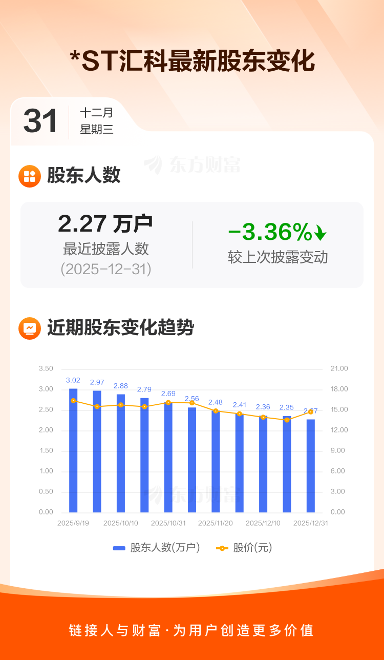 *ST汇科最新披露数据显示,截至12月31日公司股东户数为2.27万户,较上期(2025年12月19日)减少788户,降幅为3.36%。户均持有流通股数量由上期的1.03万股上升至1.06万股,户均持股金额由上期的13.88万元增加至15.63万元。