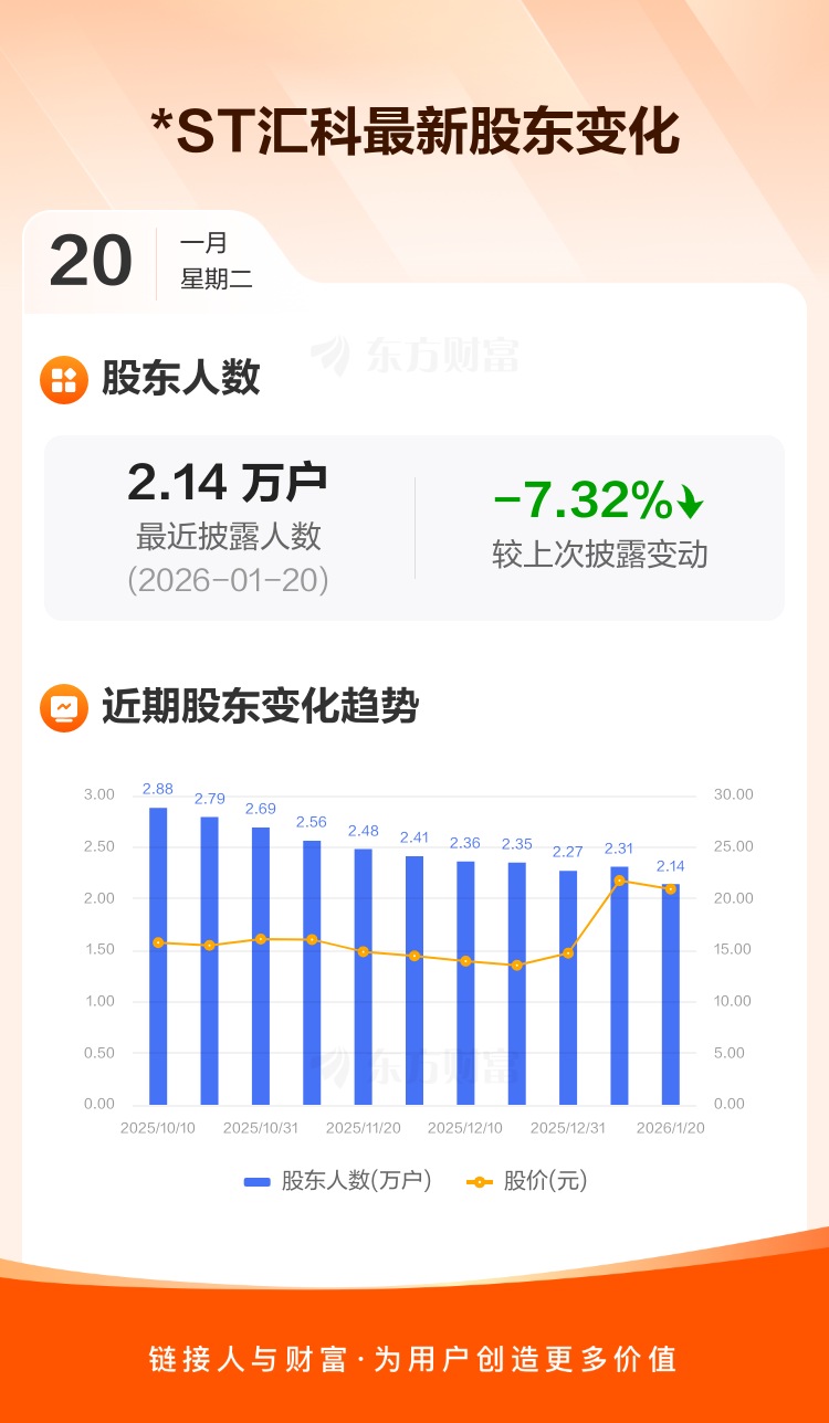 *ST汇科最新披露数据显示,截至1月20日公司股东户数为2.14万户,较上期(2026年1月9日)减少1694户,降幅为7.32%。户均持有流通股数量由上期的1.04万股上升至1.12万股,户均持股金额由上期的22.65万元增加至23.53万元。