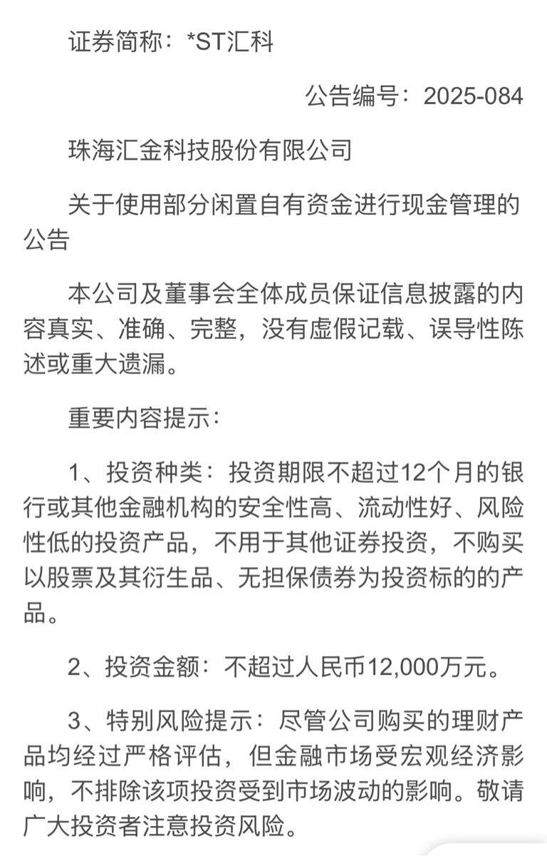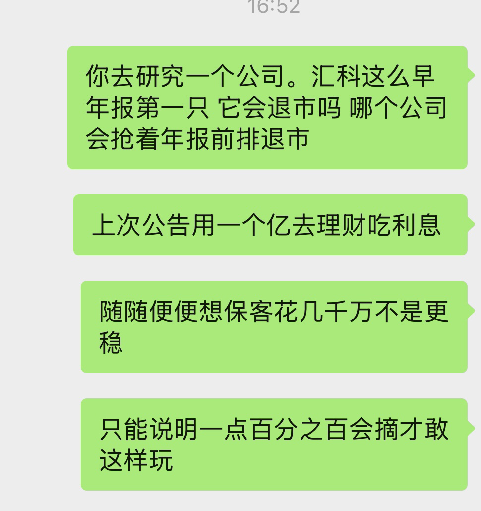 结合昨天卷商短信提示恐慌 尾盘跌停机构大肆买入 那么真像只有一个 汇科这个跌停是铁底了!公司可以有任何方法保壳然而选择了擦边刺激玩法!12月1.2亿的现金理财已经在暗示了上岸概率很大!剑走偏锋汇科一旦上岸就是一字封死!开启互金龙头大牛走势