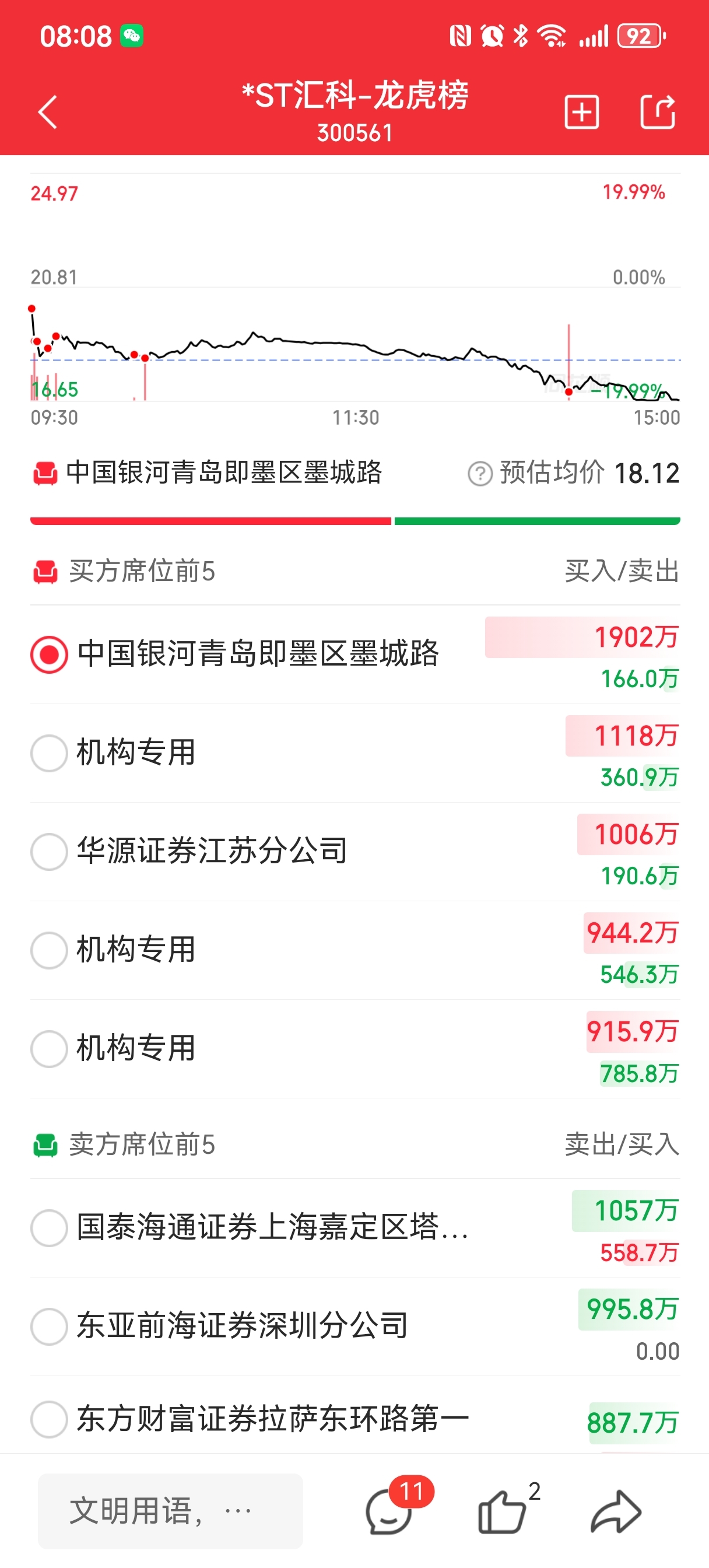 $*ST汇科(SZ300561)$ 机构大举买进