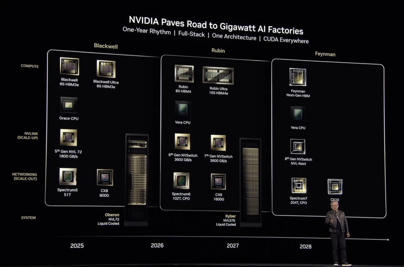 根据英伟达路线图,2027年下半年将继续推出下一代Vera Rubin Ultra芯片。该芯片实际将包含两个连接在一起的Rubin GPU,性能翻倍提升至每秒100千万亿次浮点运算。黄仁勋还首次公开了Vera Rubin之后的下一代架构Feynman,计划将在2028年面世,但未给出关于Feynman的更多技术细节。