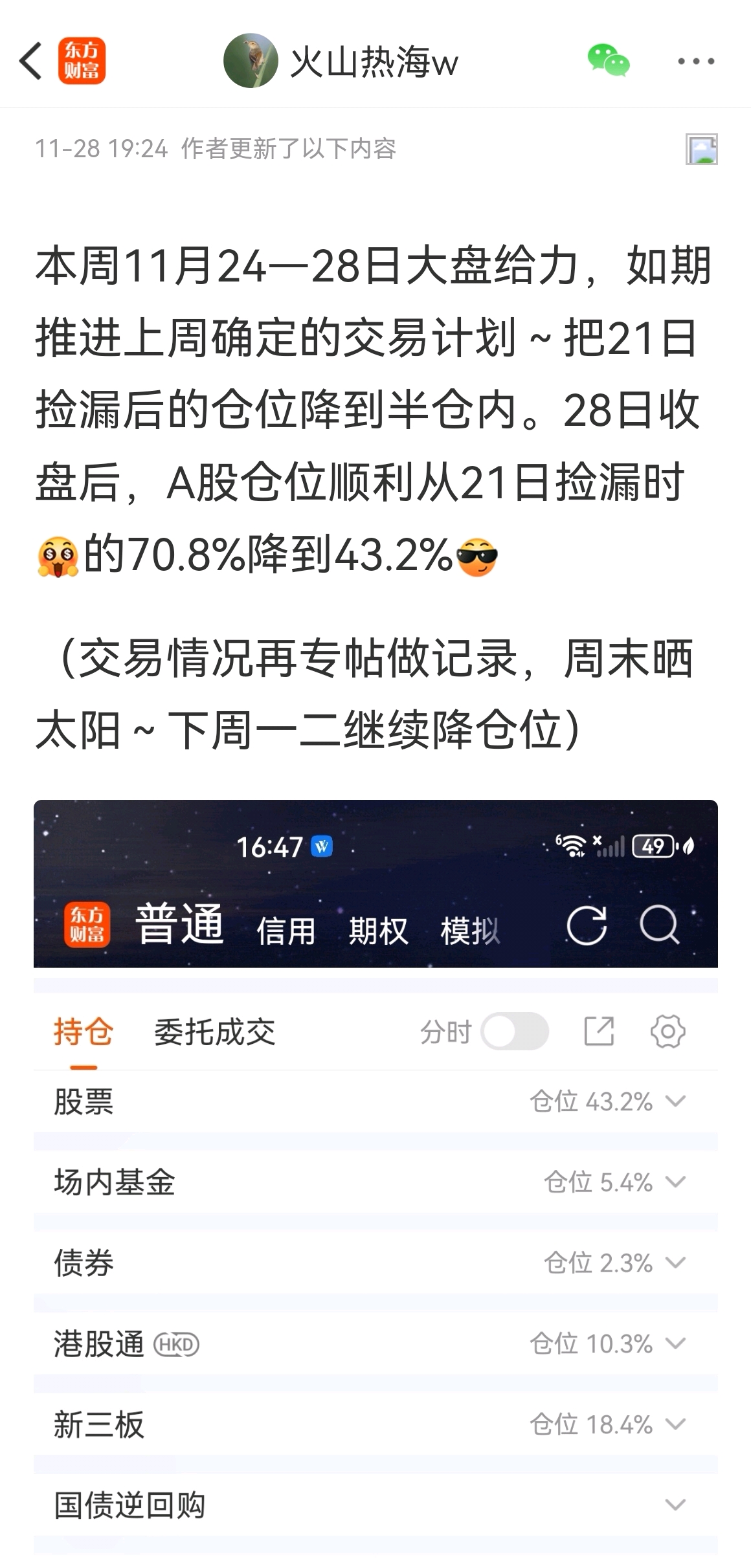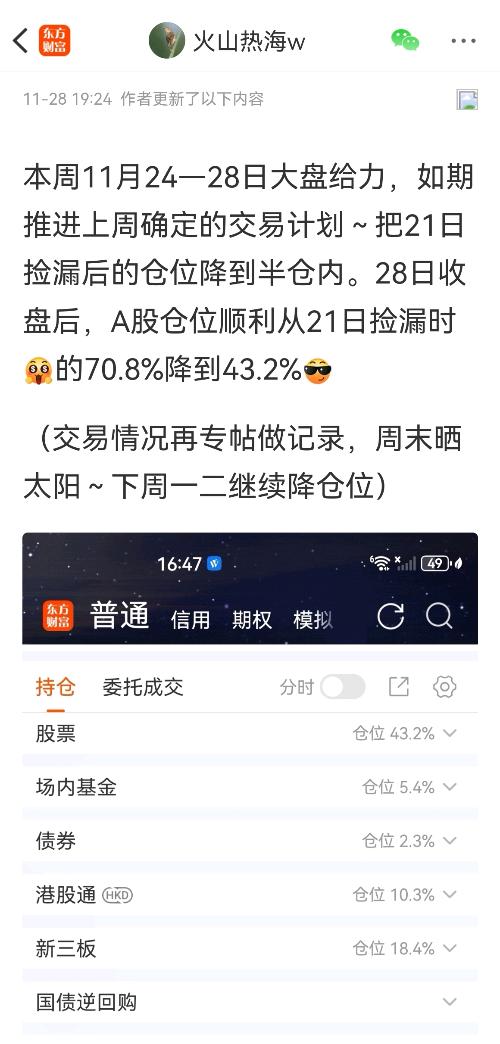 ——本周(11月24-28日)我的交易如同上周(17-21日)一样的不复杂,只是买卖方向反了过来:就是把21日在A股捡来的漏大部分卖出变现、再把新三板回落的股票捡回来!结果就是如期推进完成了上周确定的交易计划即“把A股持仓比例降到半仓内”如附图