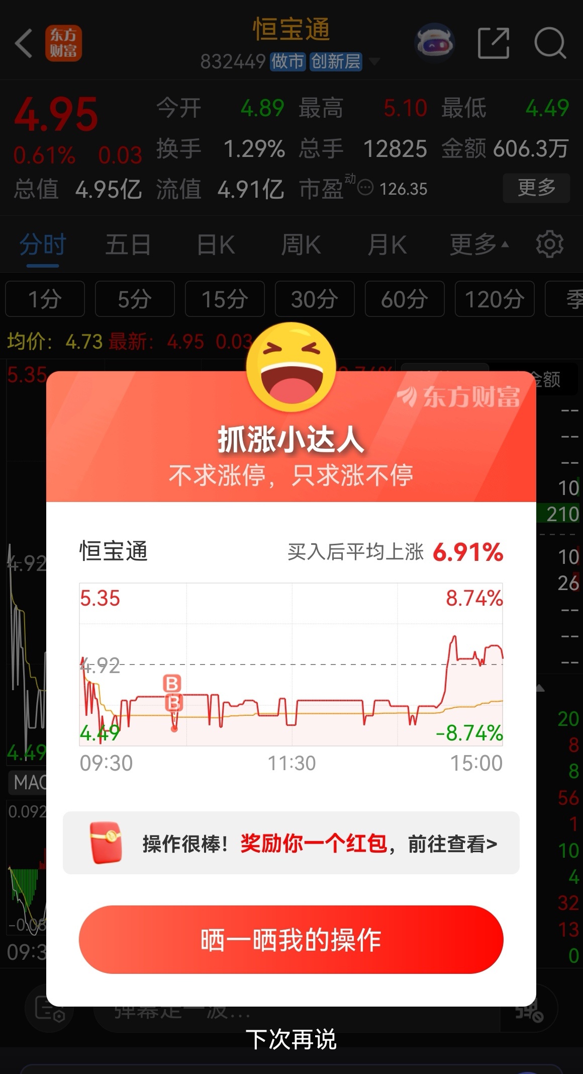 ——本周新三板仓位大幅提高主要是恒宝通及要约回购股天朗。关于天朗的回购比例我的测算是很低的(在18—28%间),我是按照23%的比例计算确定我的潜伏价格及数量,之前做过一次T以后,28日我认可的价格又买进了几单。(附图)