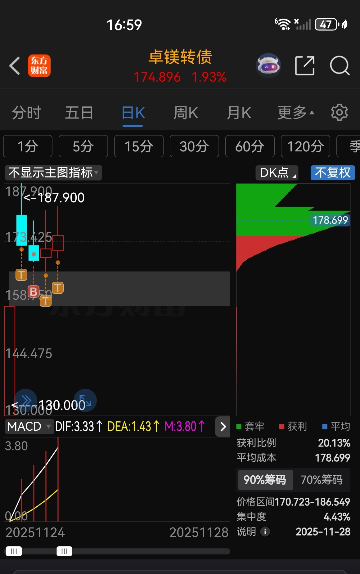 ——关于$卓镁转债(SZ123260)$,严格按照上周确定的计划进行交易即:“放到周二再考虑如何卖…”。周二开盘后转债专户的201张以均价187.3全部清仓出局(最高一单187.871);综合账户的121张周二出了2/3后每天一次T,28日反T后持有251张过周末(附图)。停牌前持有的凯众转债我在28日的帖子《不管最终的结果如何~12月1日复牌终归送来了一个期望值~凯众转债》有专门的分析,这里不作赘述。https://mguba.eastmoney.com/mguba/article/0/1631968317?r=0.4127426474914233