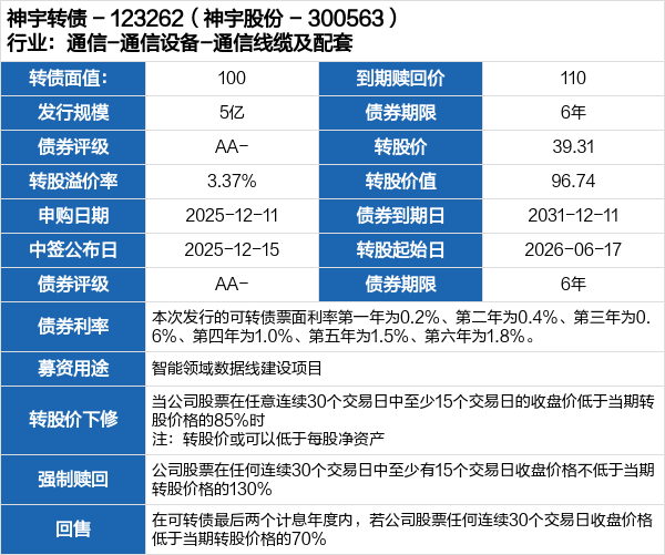 参考当前评级、规模等因子相似,正股行业相同的转债当前市场表现,神宇转债上市首日转股溢价率区间预计为30% ~ 37%,对应首日收盘价预计区间在125.76 ~ 132.53元。