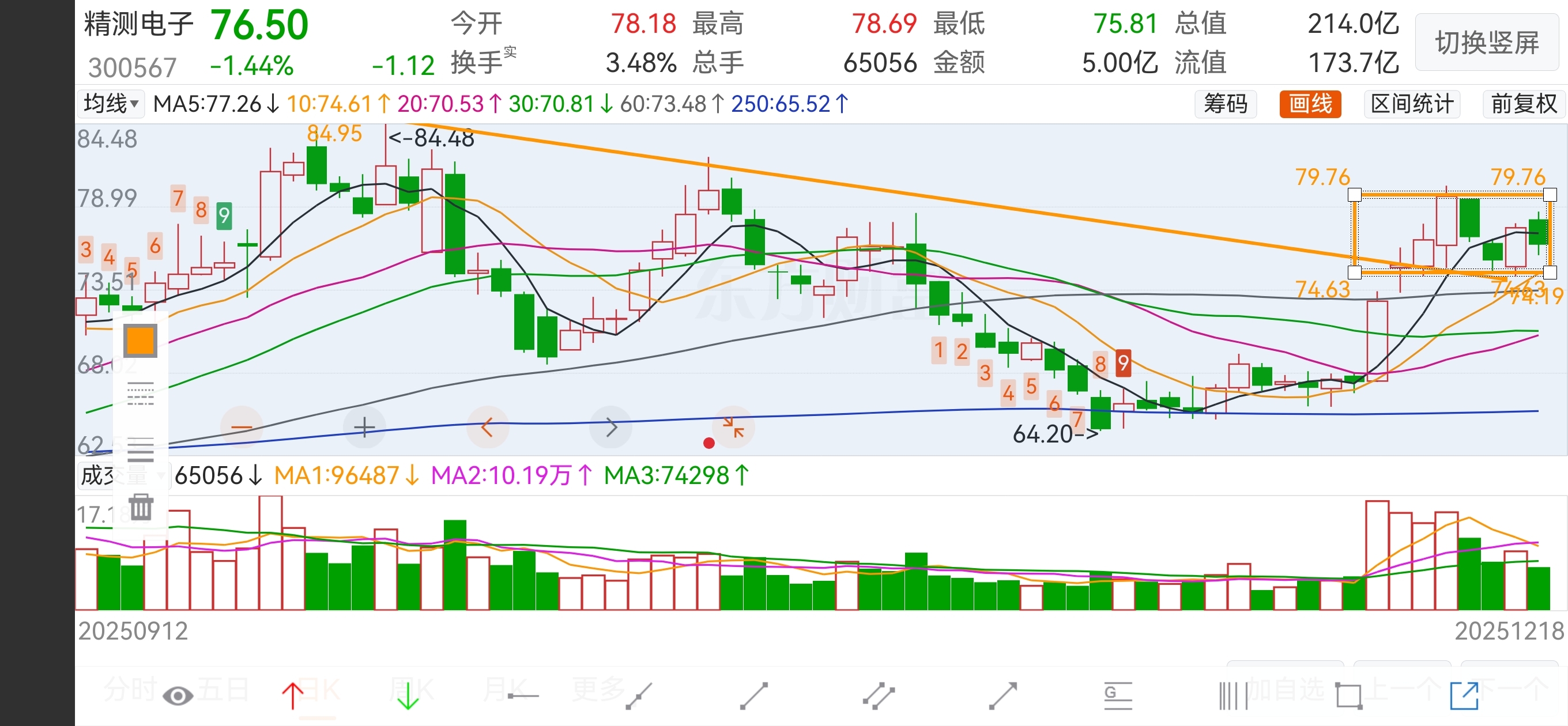 $精测电子(SZ300567)$ 放量突破下降趋势线,开始箱体震荡