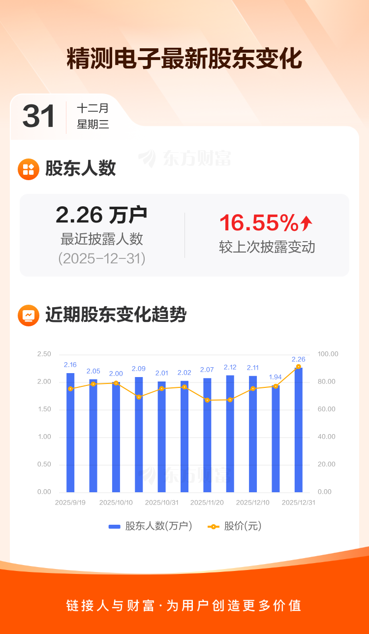 精测电子最新披露数据显示,截至12月31日公司股东户数为2.26万户,较上期(2025年12月19日)增加3208户,增幅为16.55%。户均持有流通股数量由上期的1.17万股下降至1.01万股,户均持股金额由上期的90.11万元增加至91.68万元。