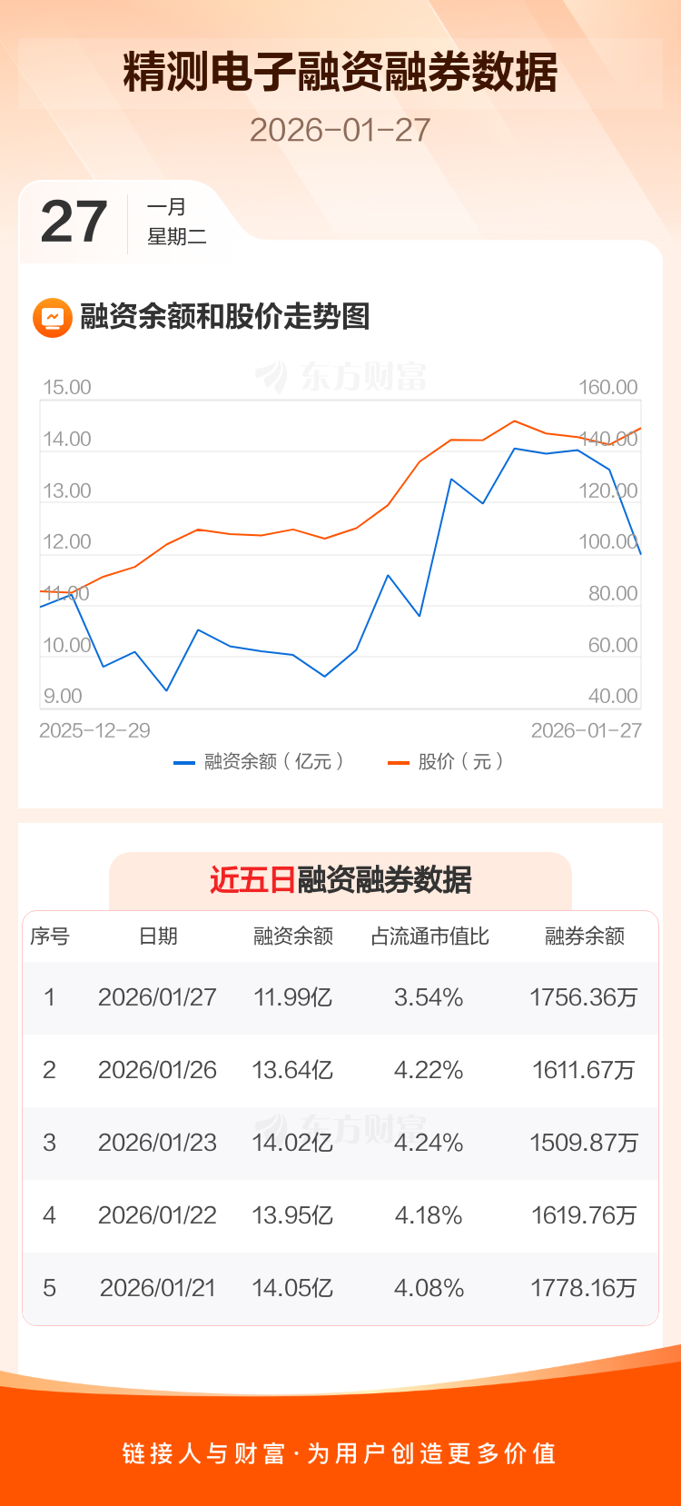 交易所最新数据显示,精测电子于2026年1月27日获融资买入3.27亿元,融资偿还4.92亿元,当日融资净偿还1.65亿元。目前,该股融资余额11.99亿,占流通市值比例为3.54%。