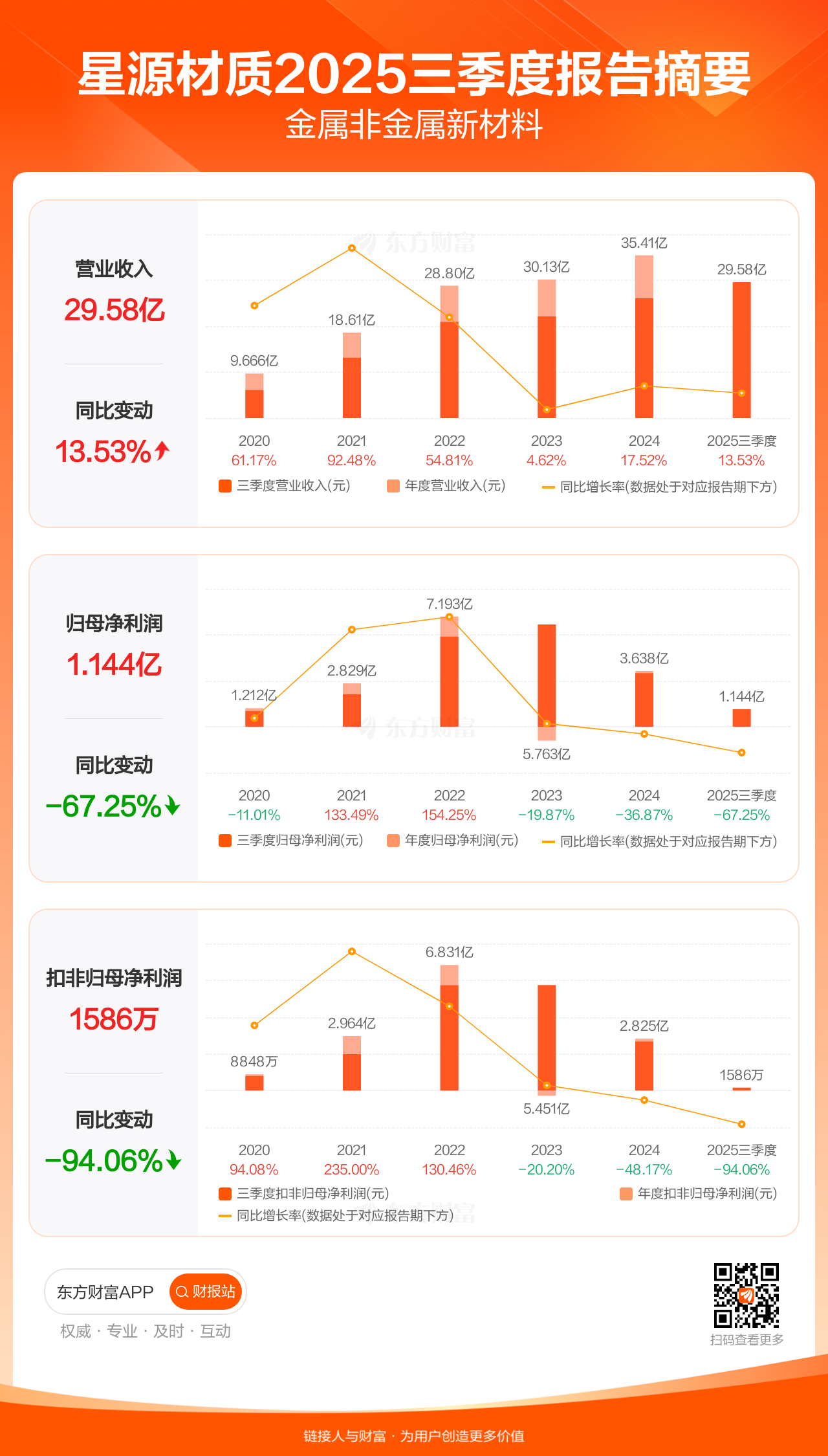 星源材质10月27日发布2025年三季报显示,公司前三季实现营业收入29.58亿元,同比增长13.53%;归母净利润1.14亿元,同比下滑67.25%;扣非归母净利润1586.01万元,同比下滑94.06%。