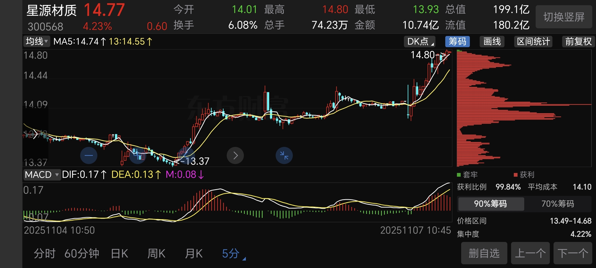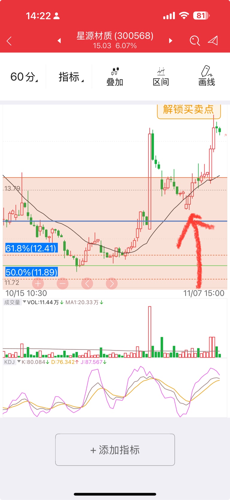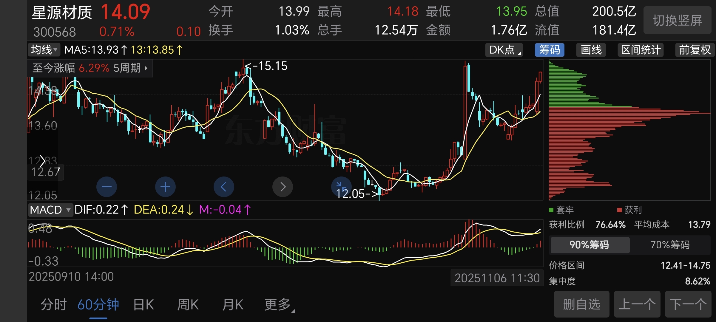 #炒股日记# $星源材质(SZ300568)$ 我在5号下午13.05分突破时候,加了仓位,在60分钟11月6号又加了仓位,现在是四分之三,因为在尝试我这次研究的小级别周期率的相互影响,所以没有完全满仓。不过现在看来还行