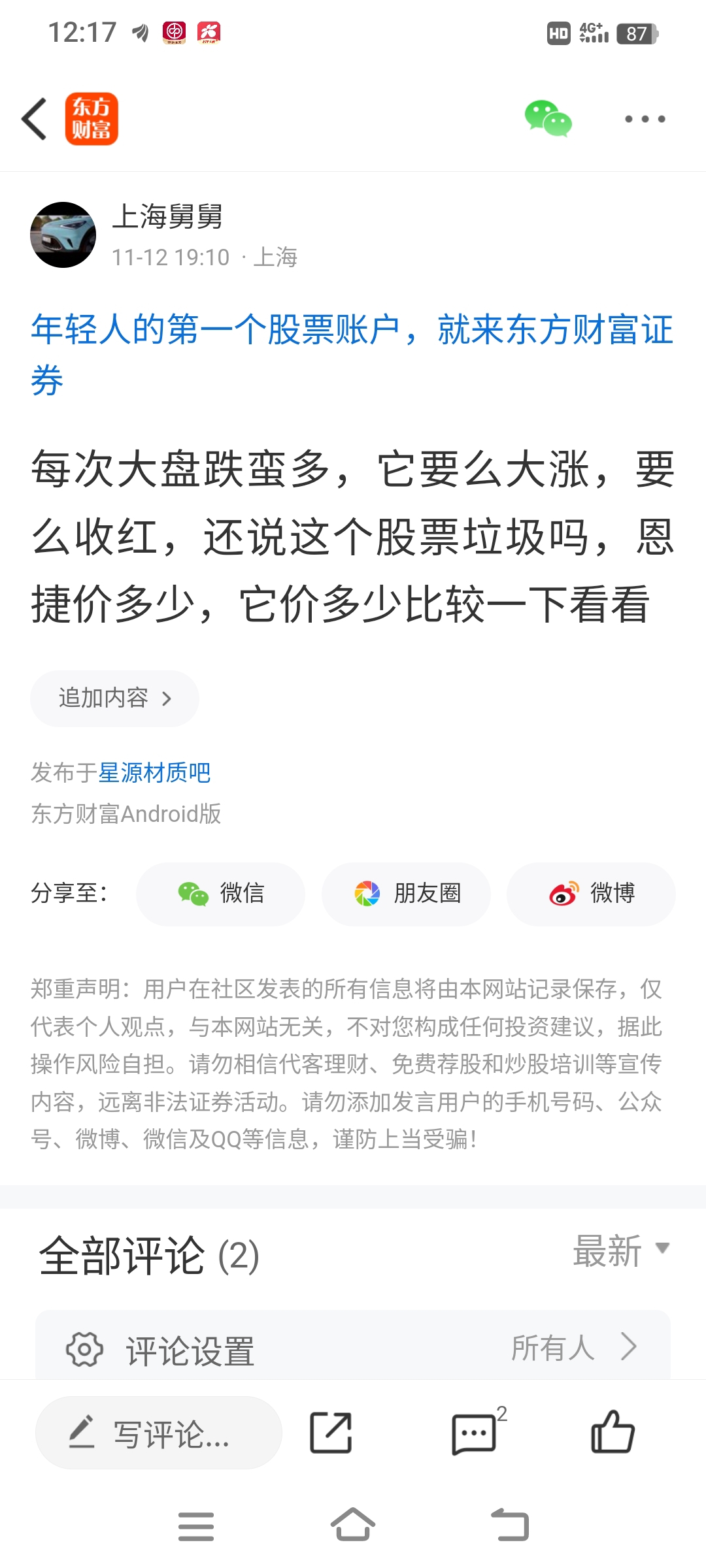 温馨提示: 1.根据《证券法》规定,禁止编造、传播虚假信息或者误导性信息,扰乱证券市场;2.用户在本社区发表的所有资料、言论等仅代表个人观点,与本网站立场无关,不对您构成任何投资建议。用户应基于自己的独立判断,自行决定证券投资并承担相应风险。《东方财富社区管理规定》
