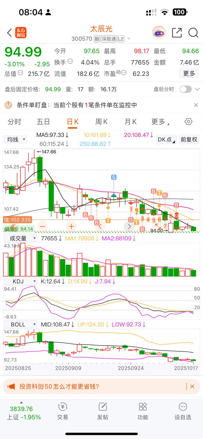 昨天我一边吃面一边深研了一下太辰光,我觉得底部最强支撑点在88.88元。目前的博