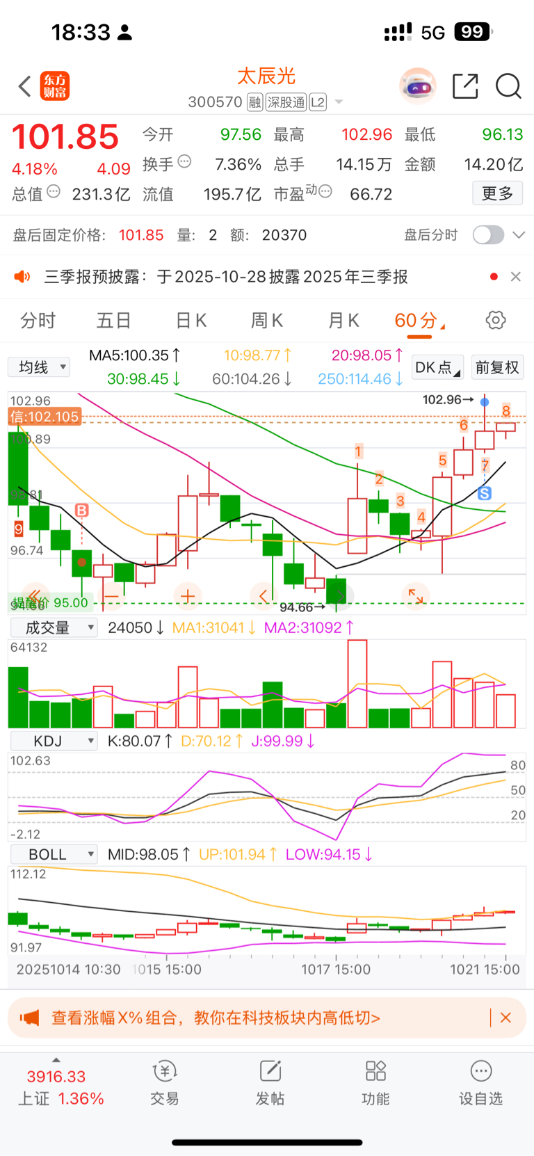 $太辰光(SZ300570)$ 60分钟图显示已步入超买区间,所以先做个T明日再冲高就清仓