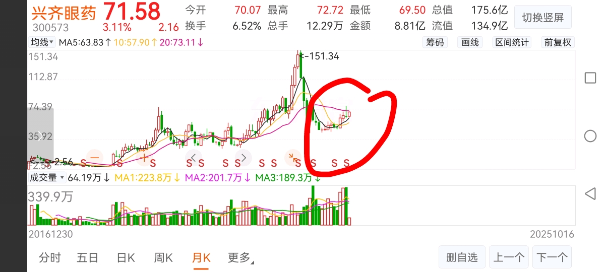 $兴齐眼药(SZ300573)$ 近期该股运行在5月我之上,20月钱之下。日线不好判断,月钱即将突破,周线回踩10周获支撑。总结,中长期有开启主升浪的可能。