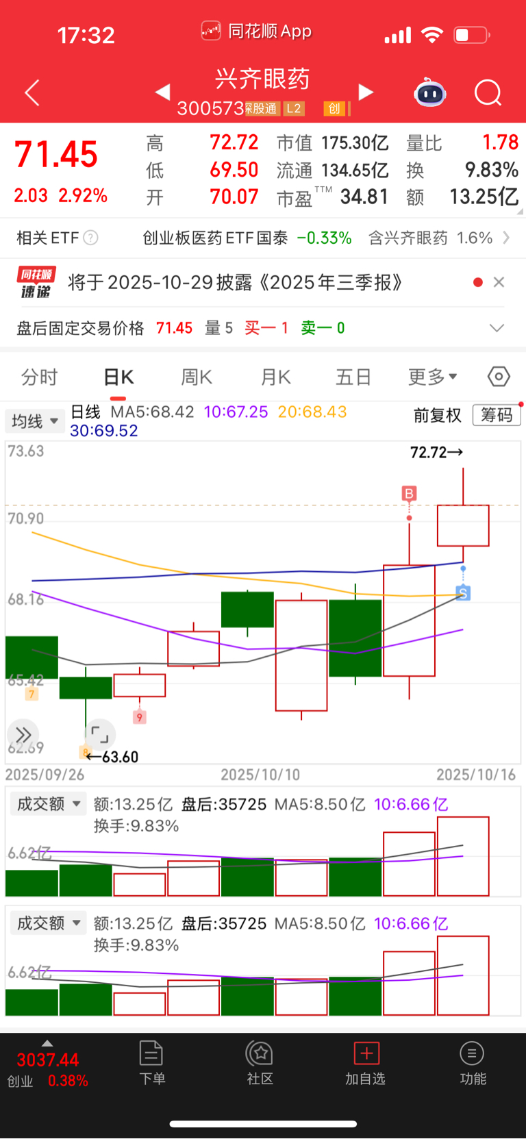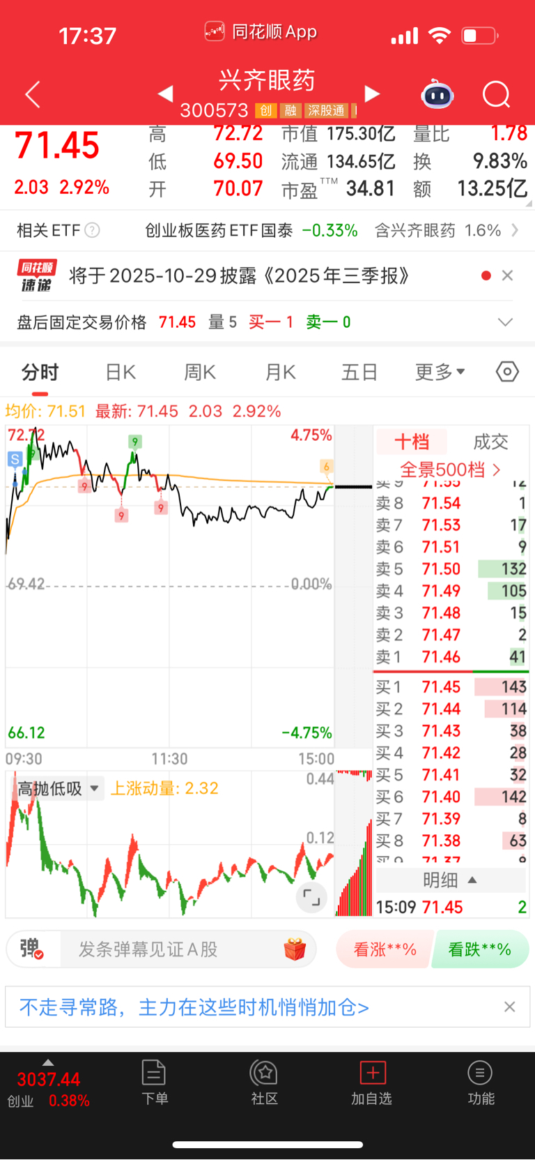 $兴齐眼药(SZ300573)$ 昨日正好有朋友在问这票,图形一看,挺好呀,小仓打野、一不小心买在最高点,想好第二天必出。今开盘拉升小赚2个点,分2次止盈。本月咖啡钱出来了。