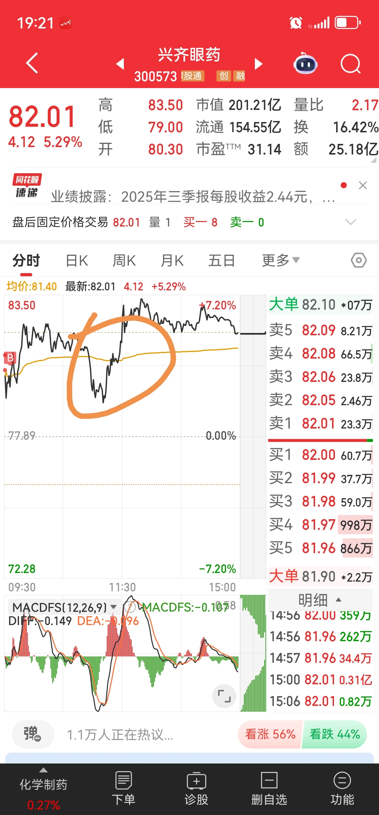 $兴齐眼药(SZ300573)$ 很明显jg吓小散吸筹!接下来由于机构筹码不够,经常会有v形分时吸筹走势!按规则净利润断层加仓!