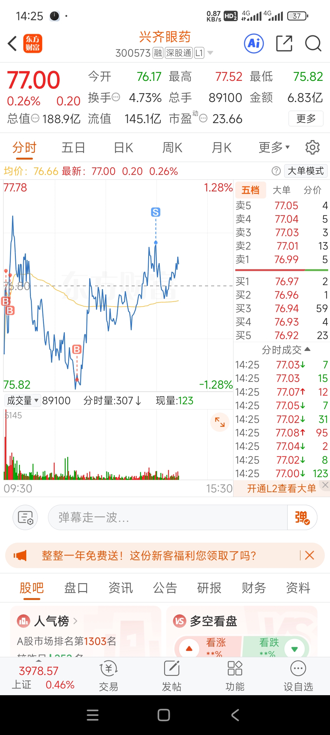 $兴齐眼药(SZ300573)$ 昨天买少了一点,今天开盘那么主动还以为要冲涨停,立马追了一点,没想到硬不起来。上午水下又追了一笔,刚刚换出来了。日线看下跌动能还没完全释放,但这里也有止跌的可能,看主力是选择主动往下回踩均线筑底还是等均线上来,但料敌从宽,还需等得起码一周。