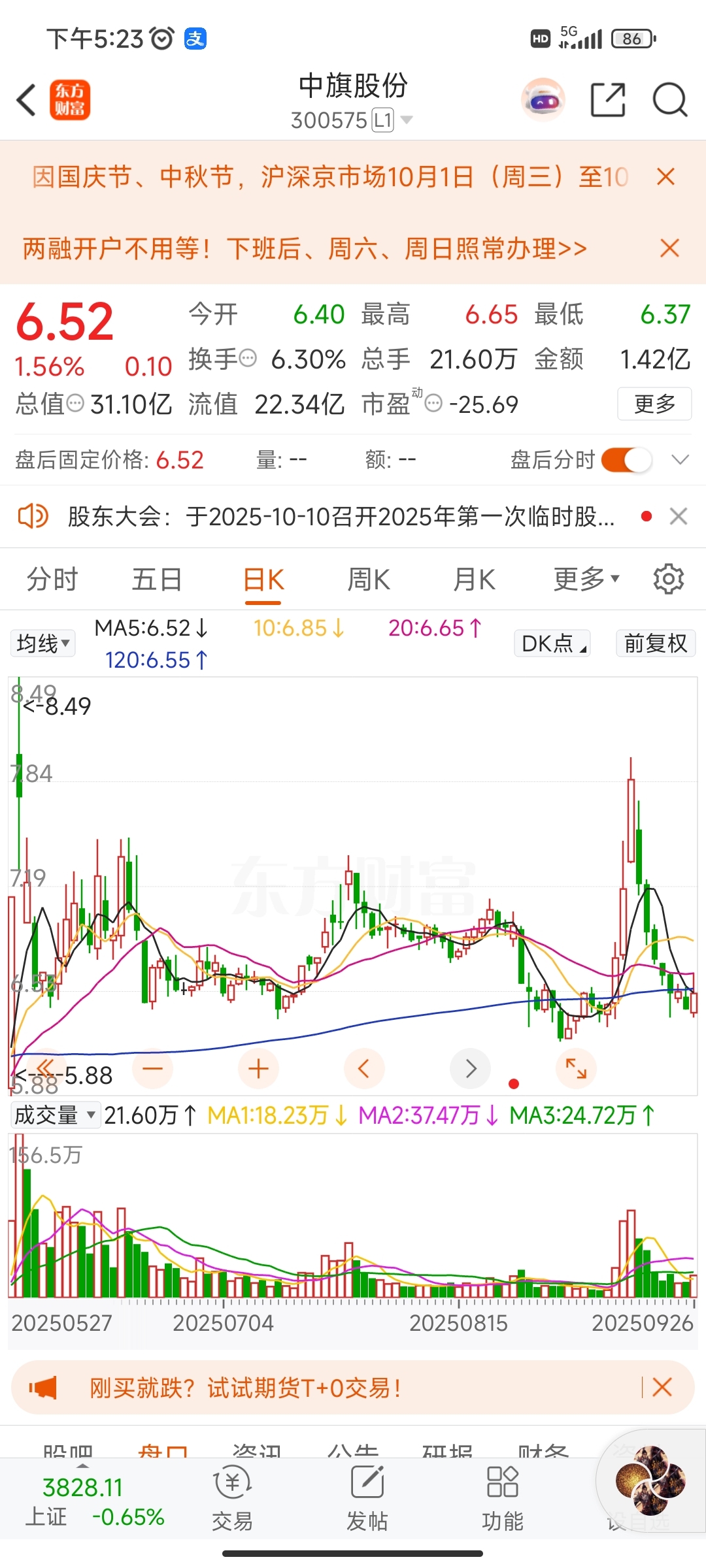 $中旗股份(SZ300575)$ 今天放量收长上影线并收在5日线绝对是穷庄为了骗韭菜接盘,下周离国庆节还有2个交易日,下周随时会尾盘砸大跌,接盘的韭菜注意安全了
