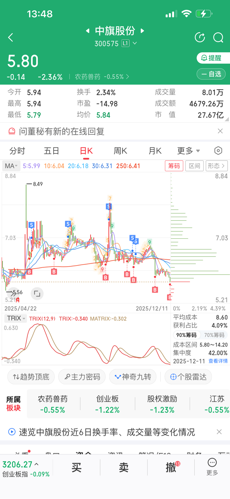 按既定价格5.8第一支撑位继续加仓,下面位置5.6,5.4继续等着低吸,整个市场摩尔之流吸血严重,人气接近冰点,农药股非市场主流,破位下行,正是逢低吸纳良机,遇急涨则减仓做踢降低成本,做好长线抗战准备。