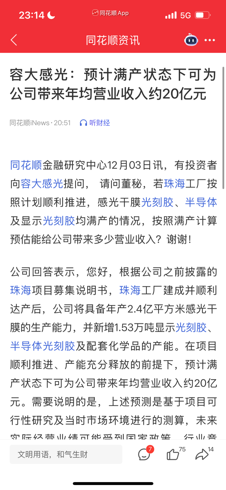 $容大感光(SZ300576)$ 要是真的,估计应该到100左右才合理