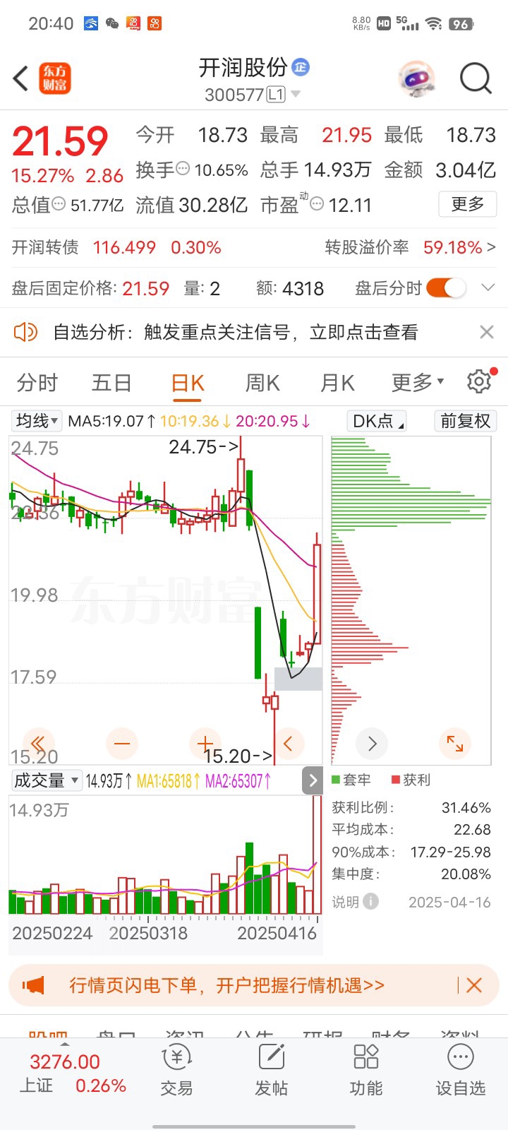 $开润股份(SZ300577)$ 最高点进去了明天能保本出吗?