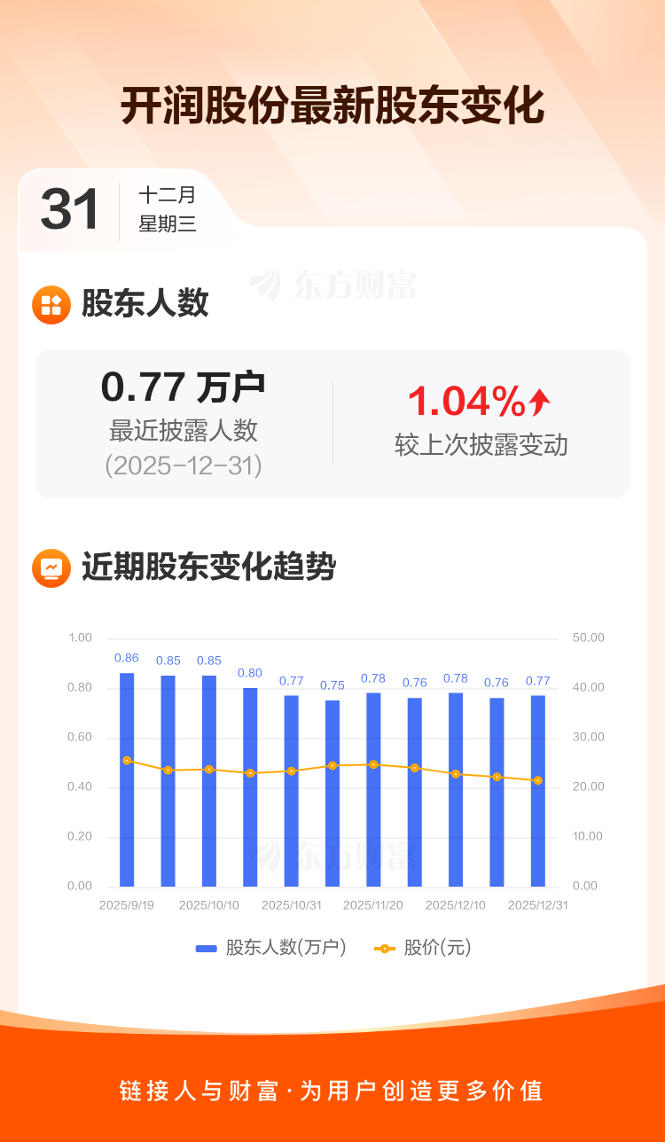 开润股份最新披露数据显示,截至12月31日公司股东户数为7665户,较上期(2025年12月19日)增加79户,增幅为1.04%。户均持有流通股数量由上期的1.84万股下降至1.82万股,户均持股金额由上期的40.70万元减少至38.93万元。