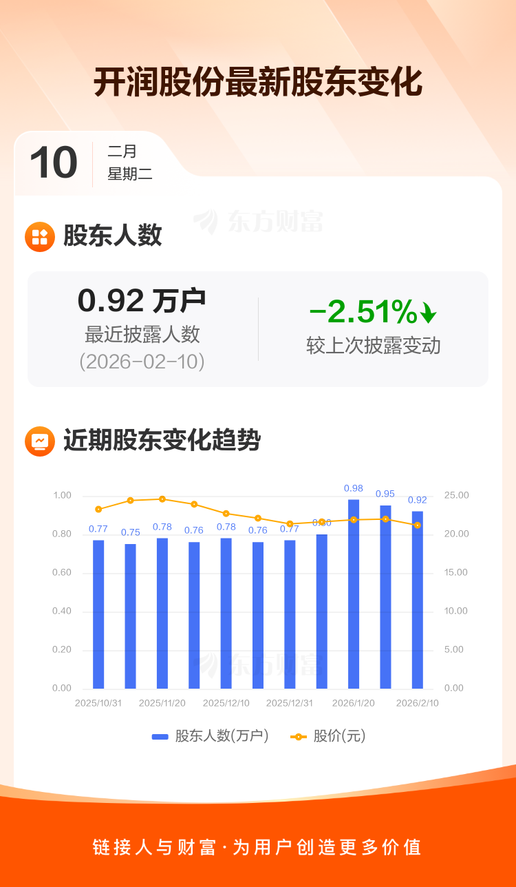 开润股份最新披露数据显示,截至2月10日公司股东户数为9227户,较上期(2026年1月30日)减少238户,降幅为2.51%。户均持有流通股数量由上期的1.50万股上升至1.54万股,户均持股金额由上期的33.03万元减少至32.65万元。