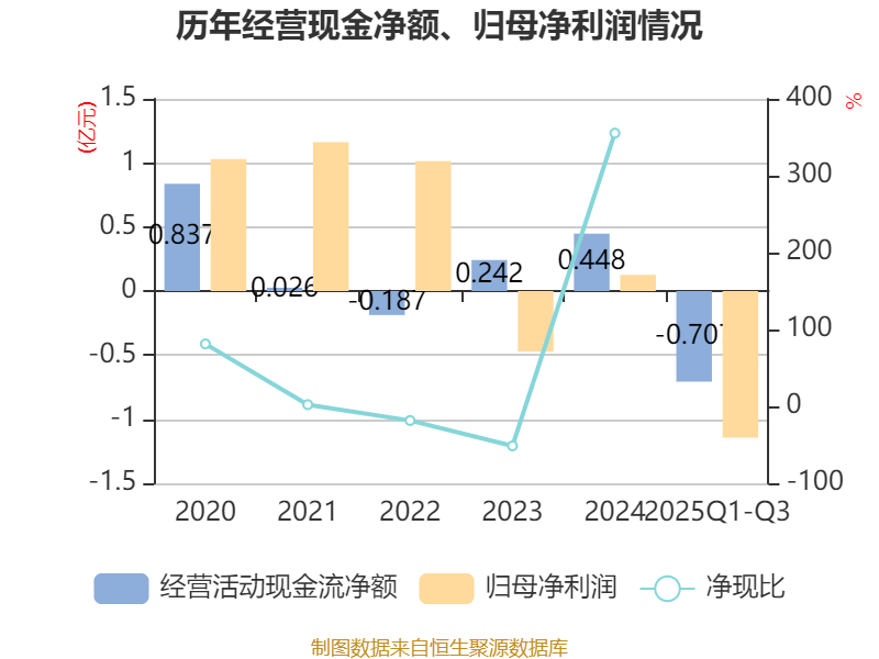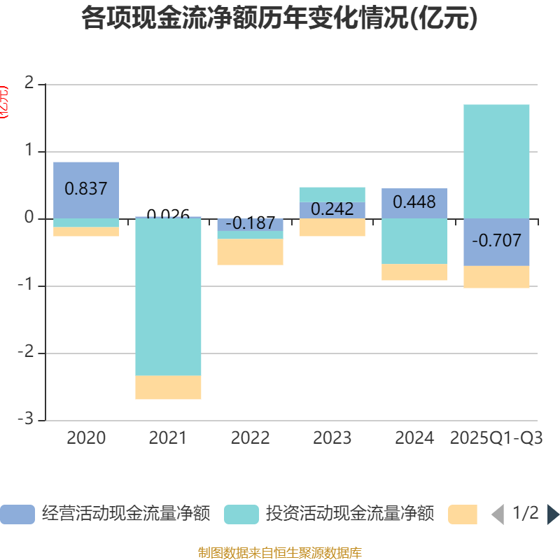 2025年前三季度,公司经营活动现金流净额为-7073.34万元,同比增加5996.59万元;筹资活动现金流净额-3298.65万元,同比减少1526.64万元;投资活动现金流净额1.69亿元,上年同期为-7306.46万元。