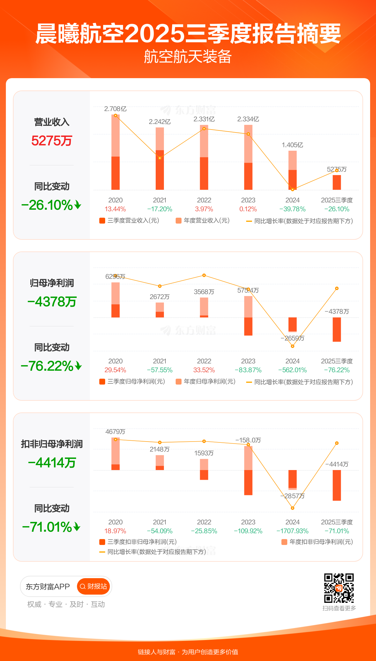 晨曦航空10月30日发布2025年三季报显示,公司前三季实现营业收入5274.54万元,同比下滑26.10%;归母净利润-4378.10万元;扣非归母净利润-4414.07万元。