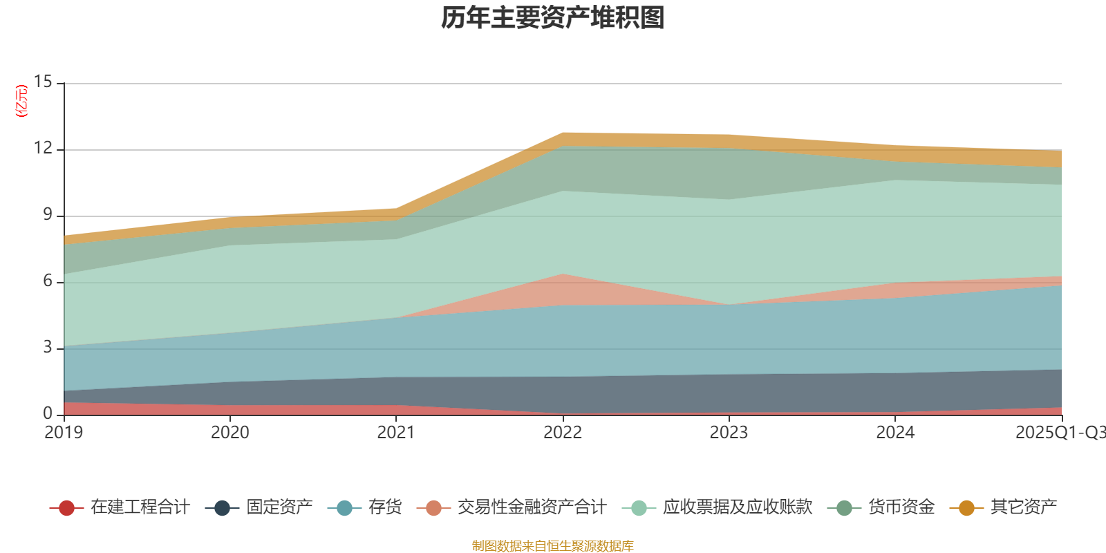 资产重大变化方面,截至2025年三季度末,公司存货较上年末增加12.08%,占公司总资产比重上升4.03个百分点;应收票据及应收账款较上年末减少10.85%,占公司总资产比重下降3.4个百分点;交易性金融资产合计较上年末减少39.79%,占公司总资产比重下降2.22个百分点;在建工程合计较上年末增加187.58%,占公司总资产比重上升1.82个百分点。