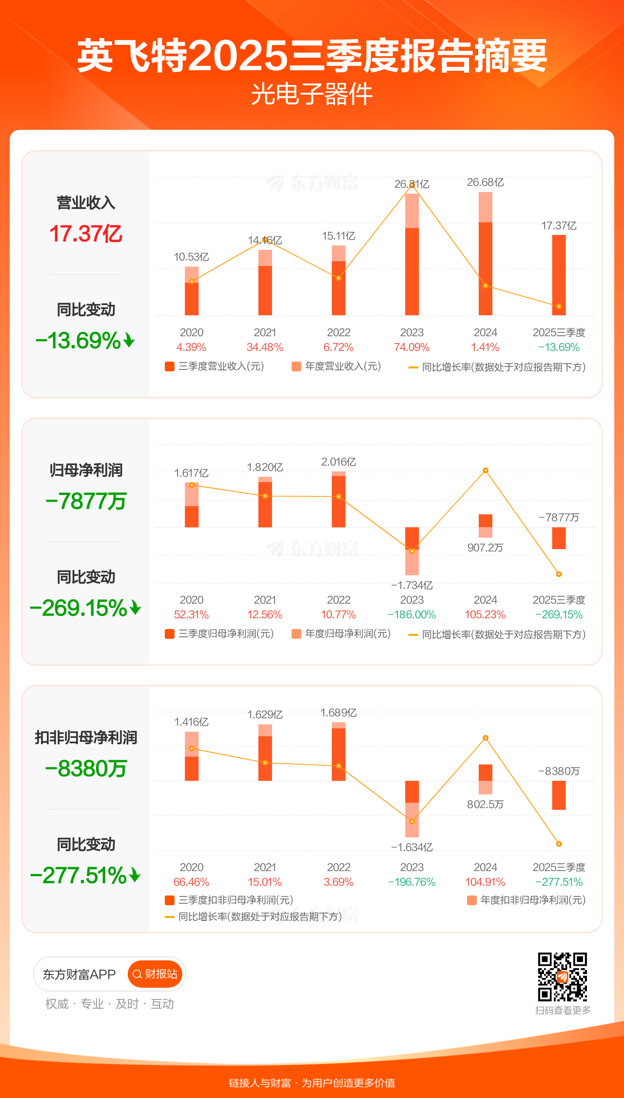 英飞特10月30日发布2025年三季报显示,公司前三季实现营业收入17.37亿元,同比下滑13.69%;归母净利润-7876.73万元;扣非归母净利润-8380.01万元。