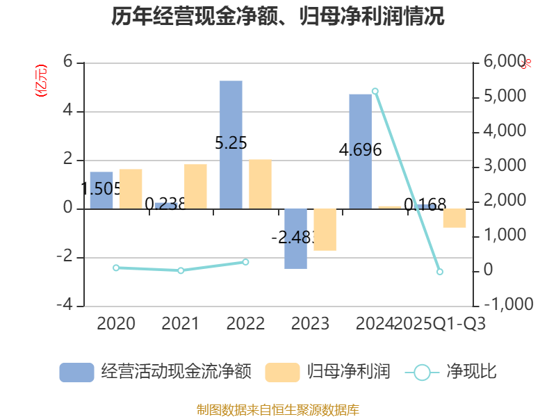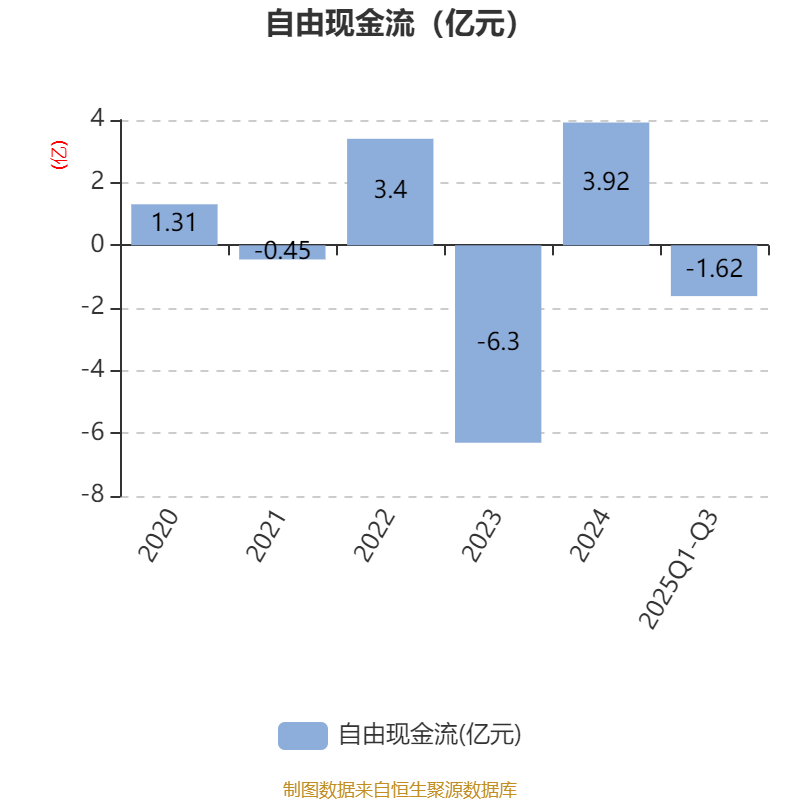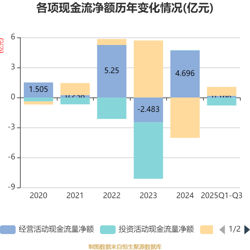 2025年前三季度,公司经营活动现金流净额为1681.75万元,同比下降93.85%;筹资活动现金流净额8946.89万元,同比增加3.52亿元;投资活动现金流净额-7995.25万元,上年同期为1728.75万元。