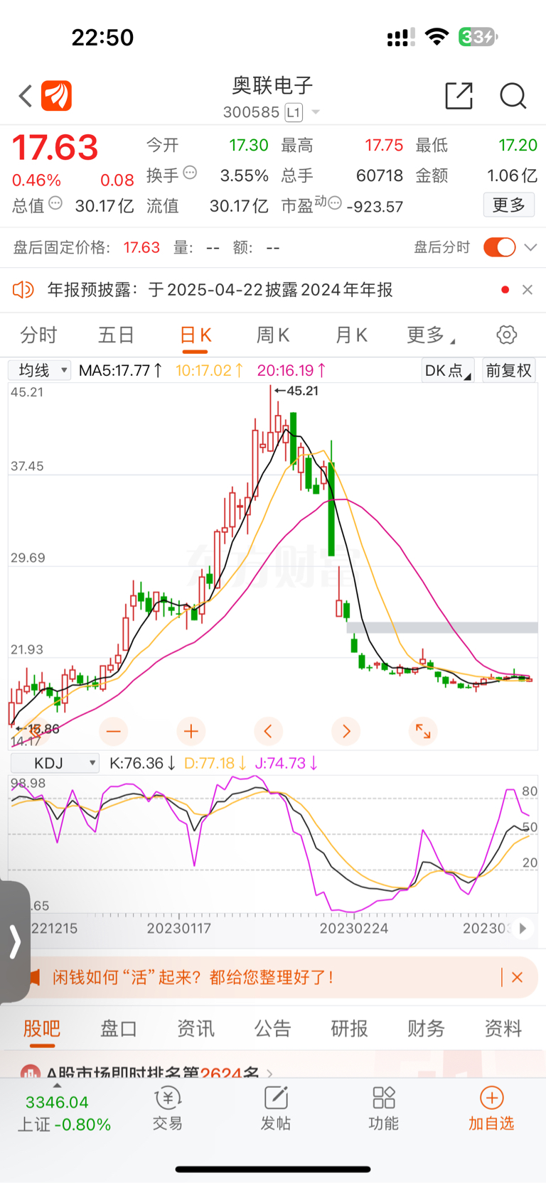 $奥联电子(SZ300585)$ 创业板下跌太狠了 这股去年也是拉到45 最低到8块才大级别反弹